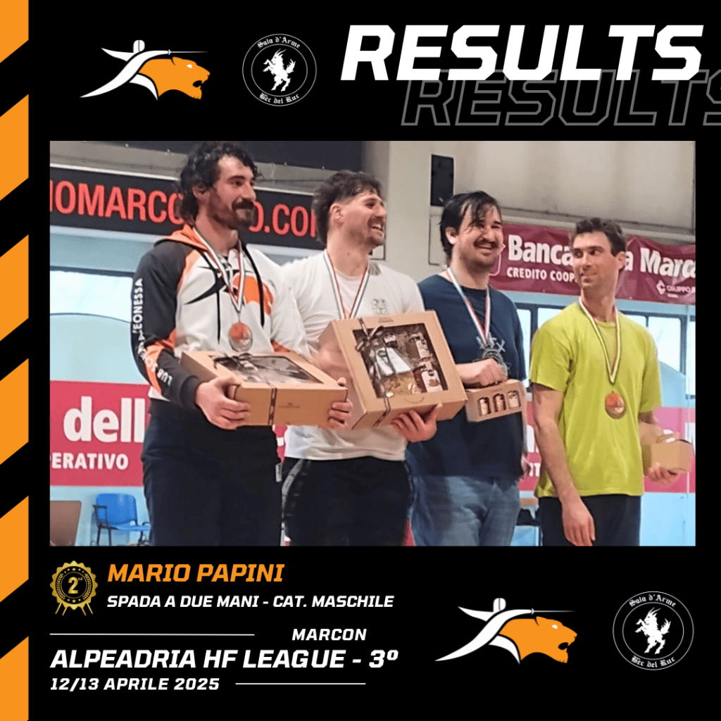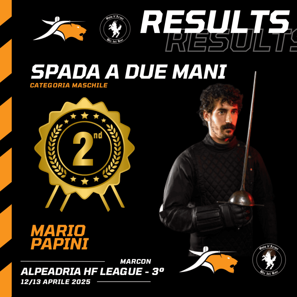 - 🥈 Mario Papini ha ottenuto un meritato argento nella Spada a Due Mani, categoria molto tecnica e combattuta.